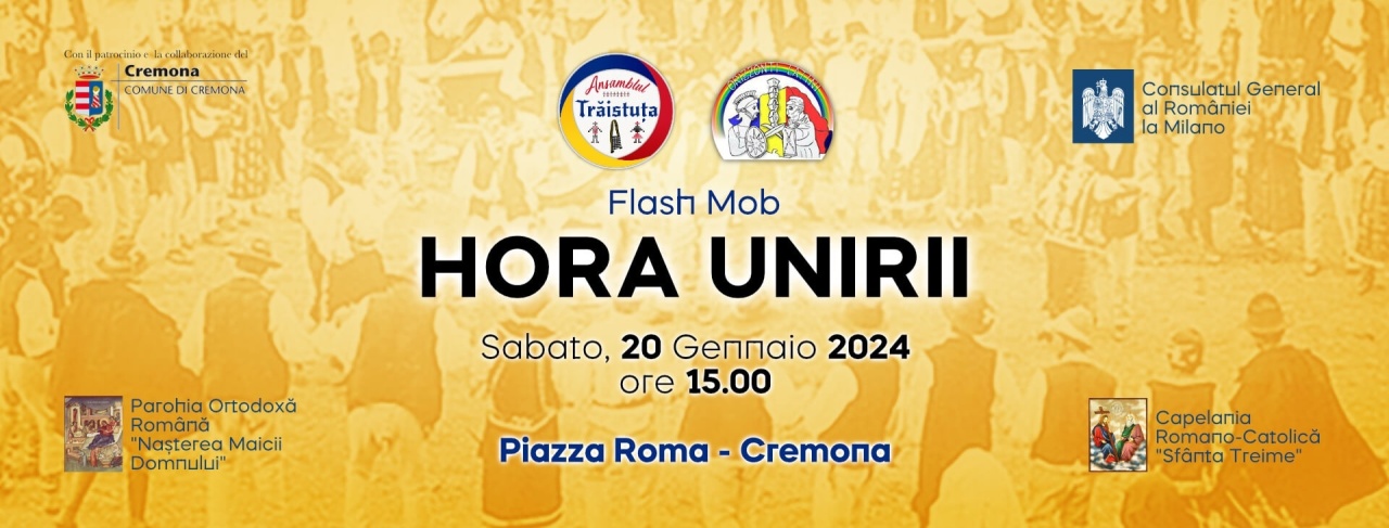 Festeggiamo con il popolo romeno e vi incontriamo a Piața Sfatului (Piazza Roma - Cremona) come fecero i nostri antenati il ​​24 gennaio 1859, quando sotto il governo di Cuza Vodă ebbe luogo l'Unione della Tăra Românească e della Moldavia.